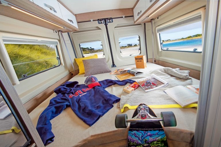 Achterin vind je het eerder genoemde in hoogte verstelbare tweepersoonsbed in lengterichting. Het bedieningspaneel is geïnstalleerd in de keuken, met optioneel een tweede paneel in de bagageruimte. Het bed, dat door vier riemen en twee rails wordt geleid, is aangenaam groot. Het ligvlak meet 194 en 191 bij 158 centimeter. Het kan echter wel een beetje wiebelen. En door het ontwerp zijn er aan de zijkanten openingen tot 20 centimeter breed, die kunnen worden afgesloten met veiligheidsnetten om te voorkomen dat mobiele telefoons of boeken eraf vallen.