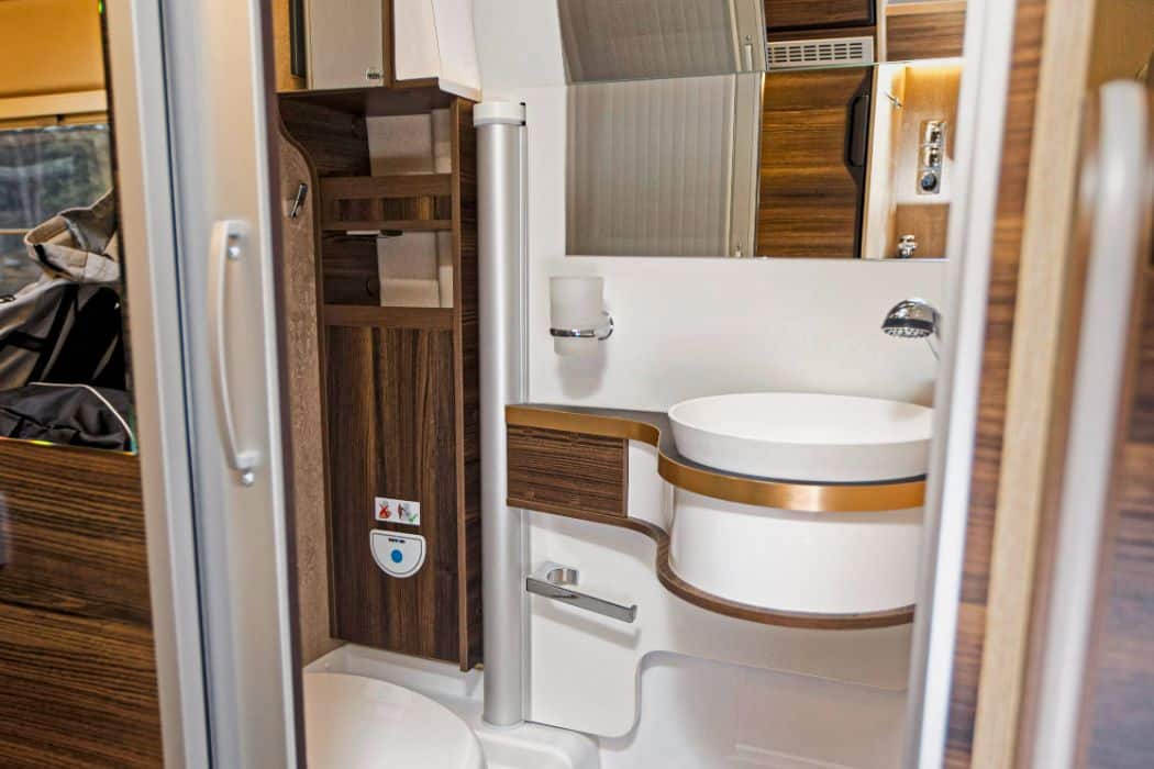 De toiletruimte heeft een voor buscampers aangenaam grote wastafel. Erachter en ernaast zijn drie spiegels geplaatst. De hoofdspiegel is alleen zo ver naar voren gekanteld dat langere mensen zichzelf er niet in kunnen zien. Om te douchen wordt de wand met de wastafel boven het toilet gedraaid.