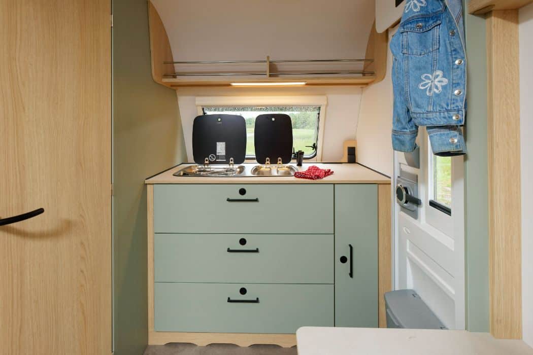 Daaronder is via een klep de Truma-boiler te bereiken en de aftapkraan voor de schoonwatertank. Tegen de voorwand staat naast de toiletruimte de keuken met driepitskookplaat, spoelbak en voldoende werkruimte op het aanrechtblad. De kookplaat en de spoelbak hebben afdekkingen, maar vormen geen geheel, wat het schoonmaken niet makkelijker maakt. De mengkraan staat apart op het werkblad.