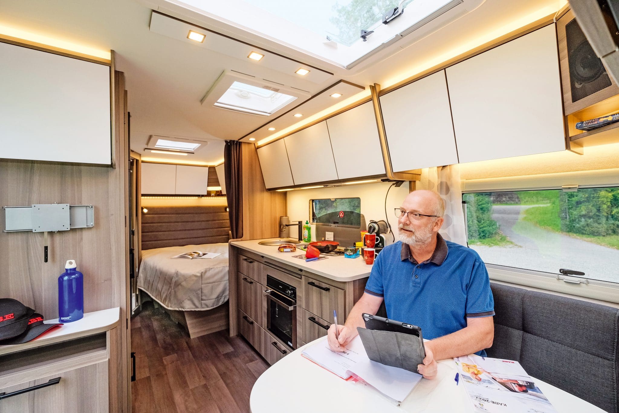 Het centrale vergrendelingssysteem voor de lades in de keuken is ook zeer praktisch. Op de camping zijn de laden altijd toegankelijk zonder dat er grendels moeten worden bediend, en voor onderweg zijn ze allemaal veilig afgesloten met een handgreep. De ventilatie aan de achterkant van het keukenblok achter is nu veel beter opgelost dan bij de Classic. Die had namelijk circulatie-openingen in het werkblad voor de warme lucht en daar kon water in komen. “Nu stroomt de warme lucht achter de doorlopende wandbekleding omhoog naar de bovenzijde van de bovenkasten, wat een goede oplossing is.”