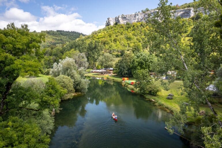 Kanoën op de rivier de Loue terwijl je uitkijkt op het typische krijtrotsenlandschap van de Jura.