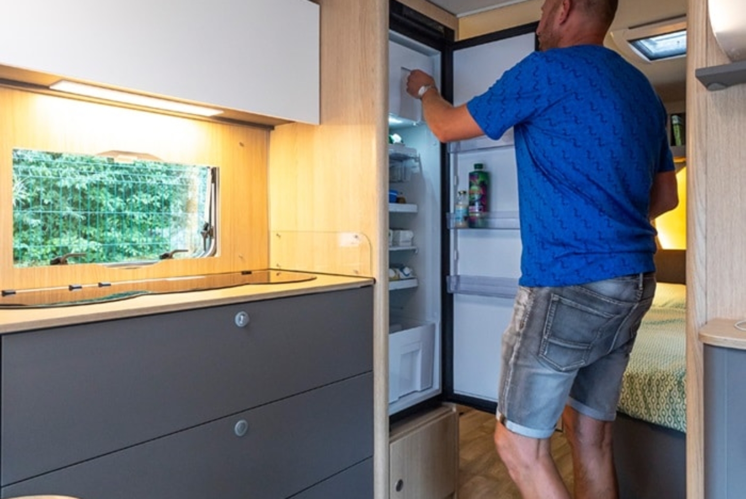 “Met twee volwassenen kun je prima slapen. Eén zijde is korter voor de doorloop maar daar heb je geen last van. De zithoek kun je eenvoudig ombouwen naar bed (212 x 126 cm) en dat is groot genoeg voor twee kinderen. De kussens schuiven alleen iets als je de zithoek als bed gebruikt. Voor kinderen is dat niet vervelend maar als volwassene merk je dat. De Tandero heeft een praktische keuken met heel veel opbergruimte en een ruime koelkast met vriesvak.